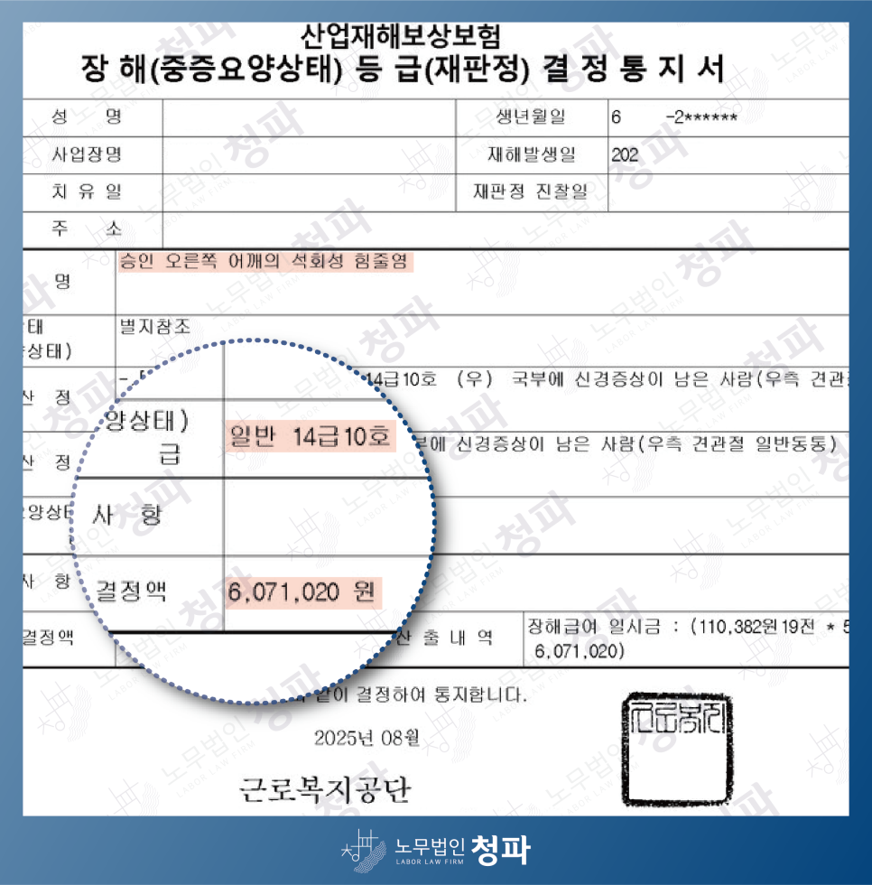 '오른쪽 어깨의 석회성 힘줄염'을 진단받은 뒤 노무법인 청파에 산재를 의뢰하셨습니다.