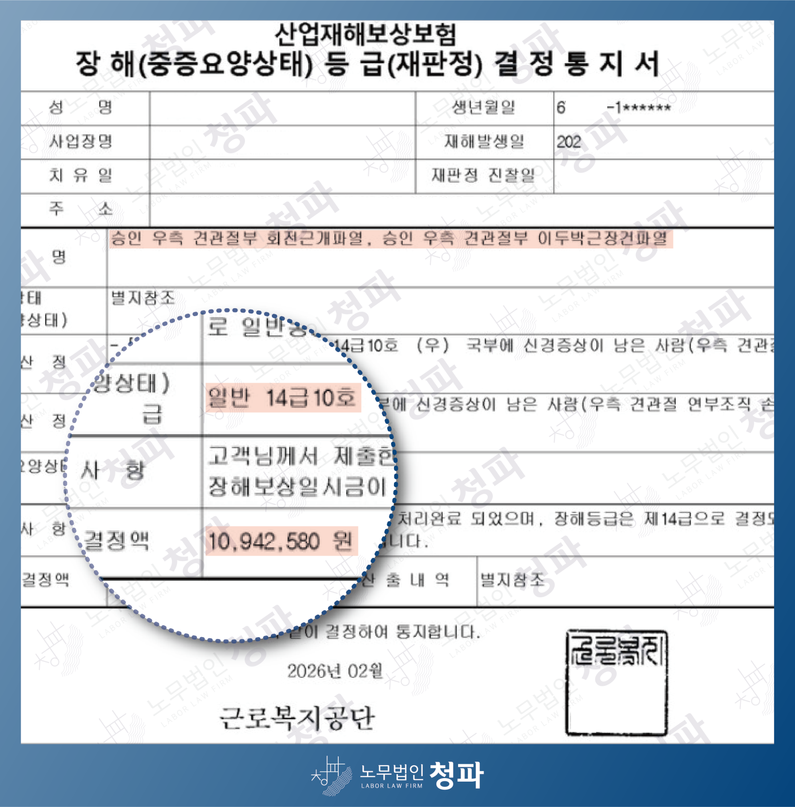 치료비, 휴업급여뿐만 아니라 장해등급 제 14급으로 약 1,000만 원의 장해급여를 보상받으셨습니다.