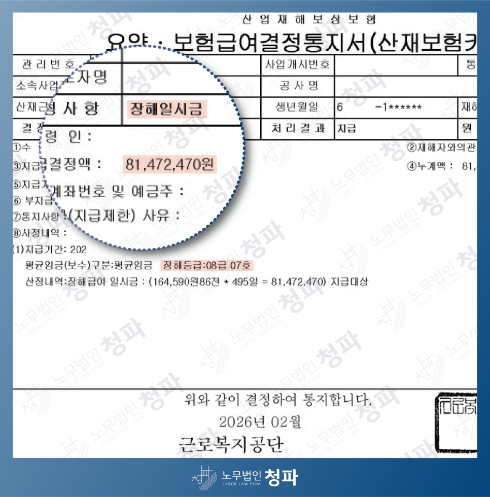 노무법인 청파에서 장해등급 가능성과 보상 범위를 먼저 점검해 보시기 바랍니다.