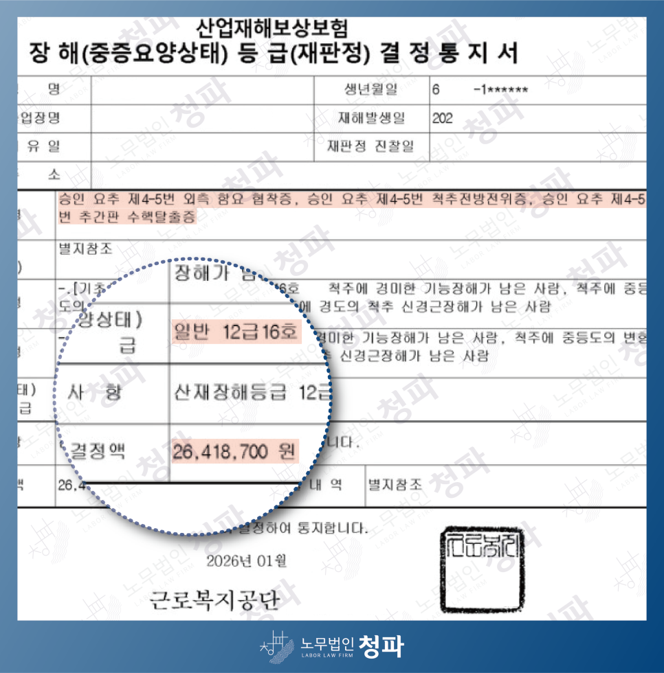 치료와 수술 후 노무법인 청파에 산재를 의뢰하셨습니다.