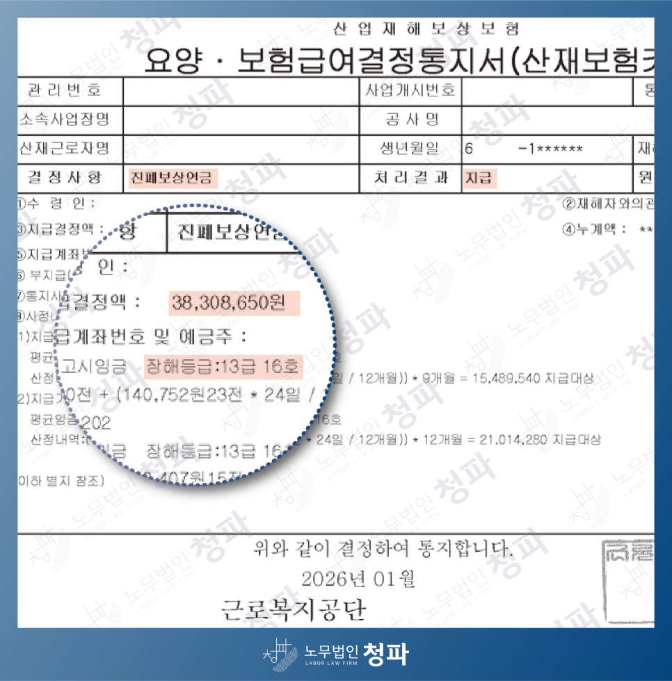 승인 이후에도 연금 산정 및 필요 시 평균임금 정정까지 재해자의 상황에 맞추어 정리해 드립니다.