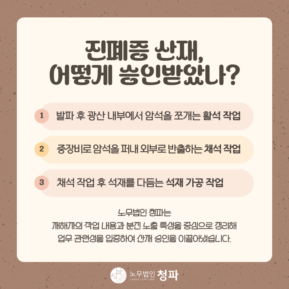 '진폐증' 진단을 받은 뒤 노무법인 청파에 산재를 의뢰하셨습니다.