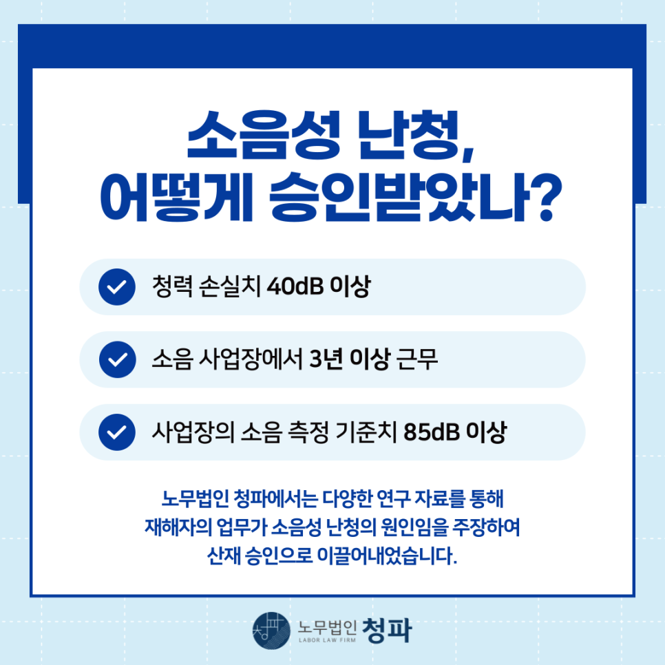 소음성 난청 산재 신청의 경우 다음과 같은 세 가지의 기준이 모두 충족되어야 합니다.