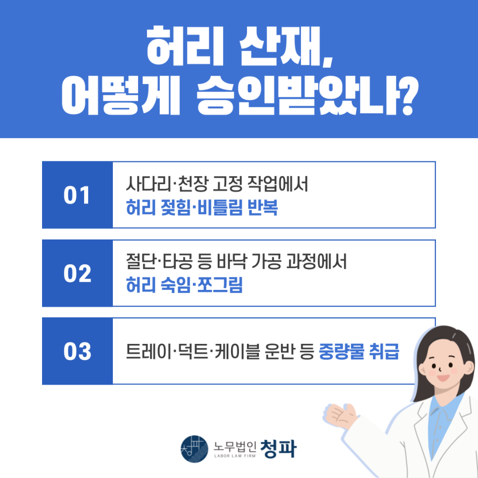 허리 통증으로 치료 중이시라면, 산재 가능성을 한 번 점검해 보시길 권해드립니다.