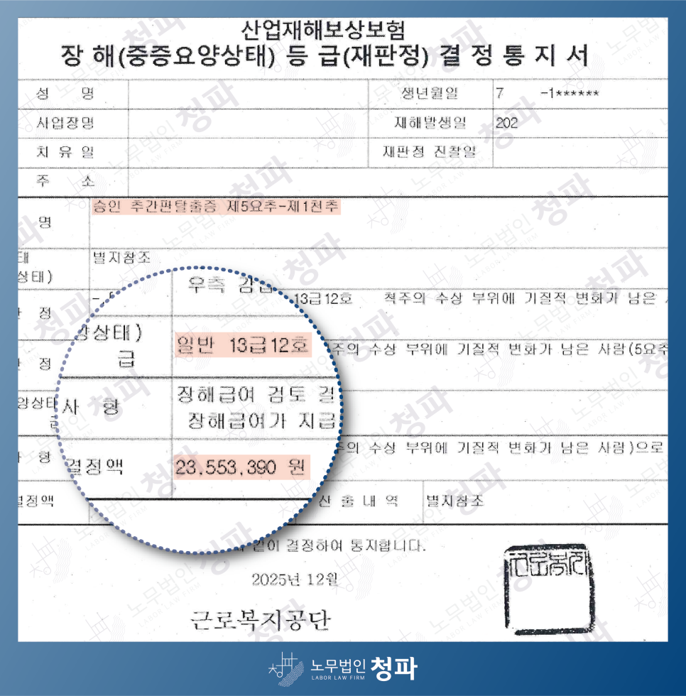 장해등급 제 13급으로 약 2,300만 원의 장해급여를 보상받으셨습니다.