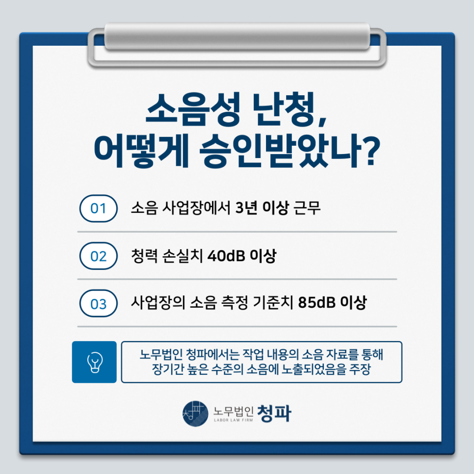 소음저감장치와 같은 안전 설비가 도입되기 전에 입사하여 소음 노출 정도가 훨씬 심하였음을 주장하여 산재 승인으로 이끌어냈습니다.