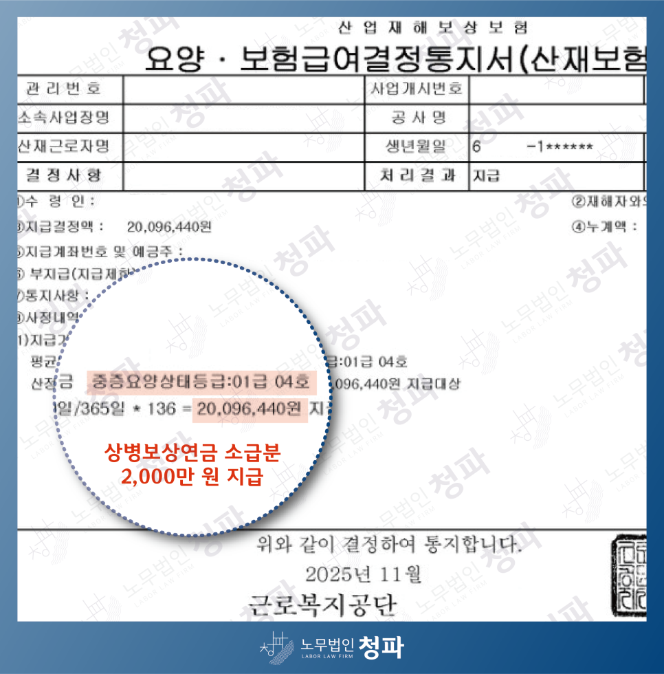 휴업급여부터 상병보상연금까지 정확하게 보상받을 수 있도록 돕고 있습니다.